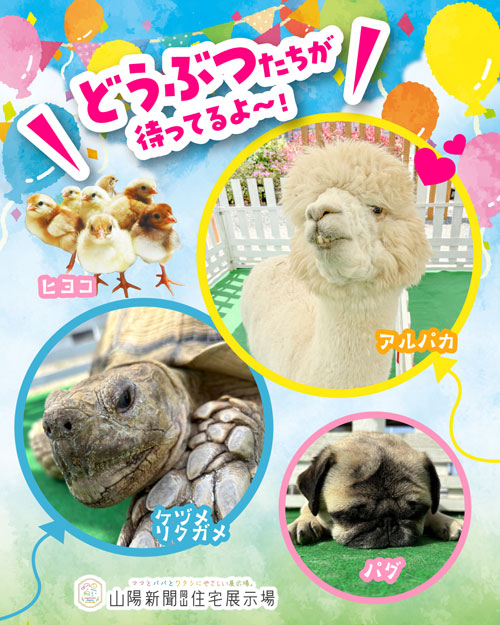 アルパカ、ヤギ、ヒツジ、ケヅメリクガメ、コールダック、ウサギ、ひよこ、パグ、ハリネズミ、モルモット、メンフクロウ、リチャードソンジリス、テンレックたちが展示場にやってくる!動物たちとのふれあいで、そのぬくもりと癒しを体験しよう!
